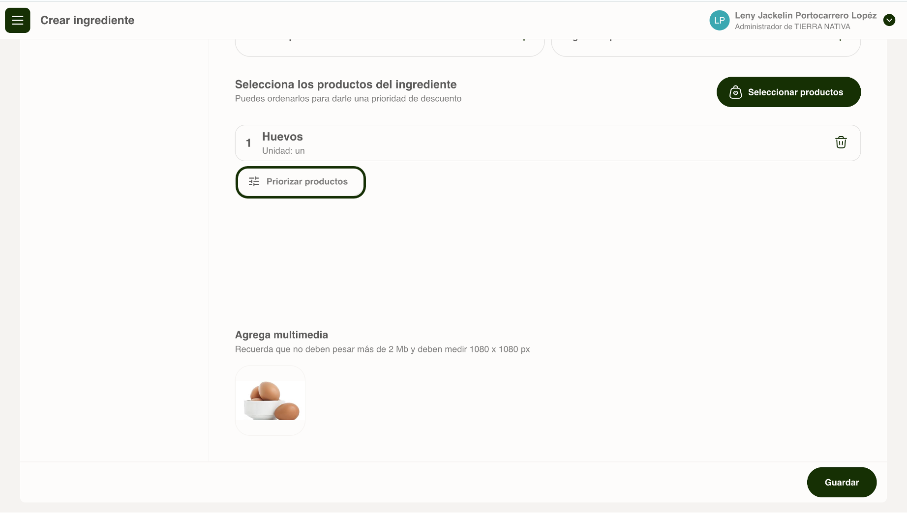 10. Finalmente hacemos clic en “Guardar” y nuestro ingrediente se habrá creado con éxito.