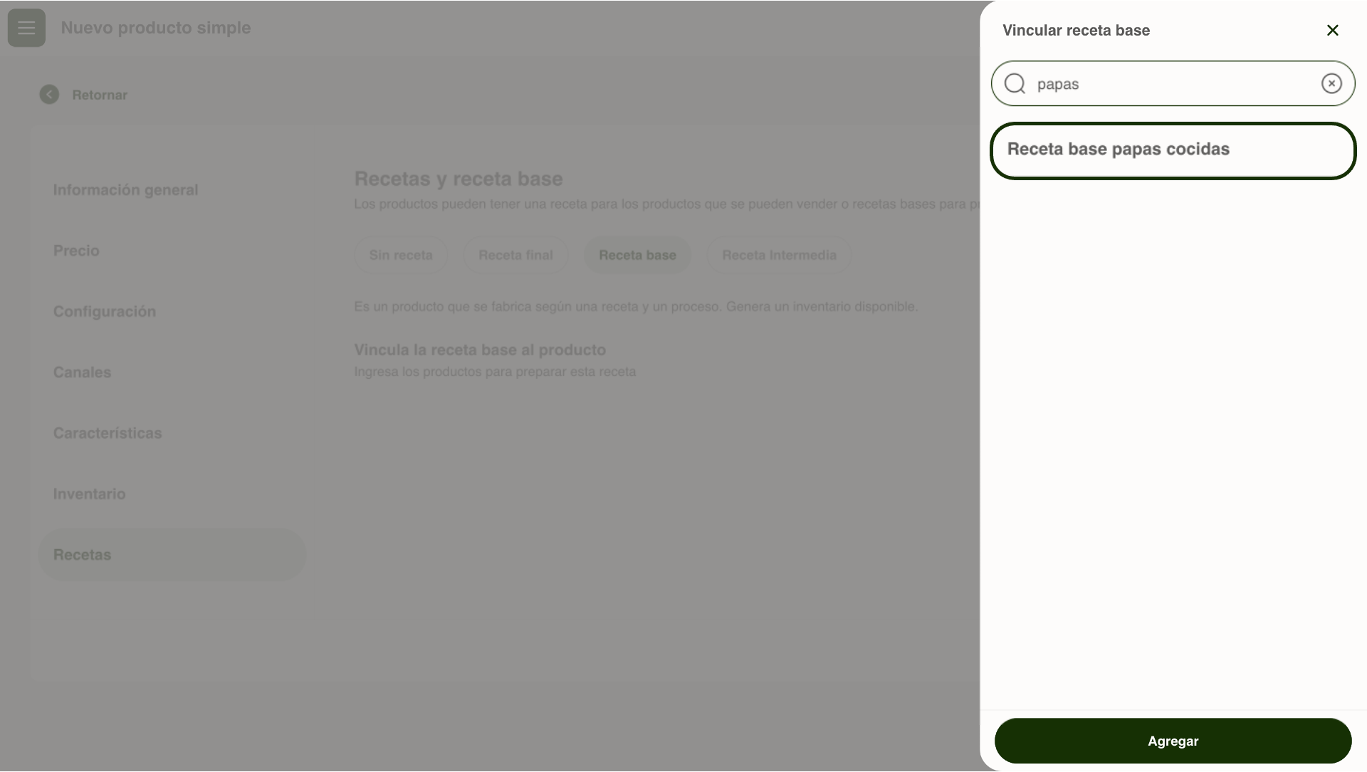 6. Finalmente vinculamos este producto con su receta base, accedemos a la sección “recetas”