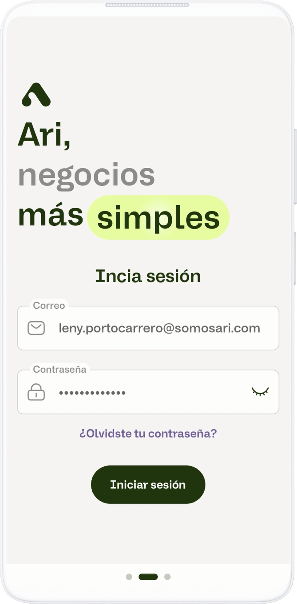 1. Para iniciar accedemos a la app Ari, usando nuestro usuario y contraseña o PIN de acceso. | ![]() |