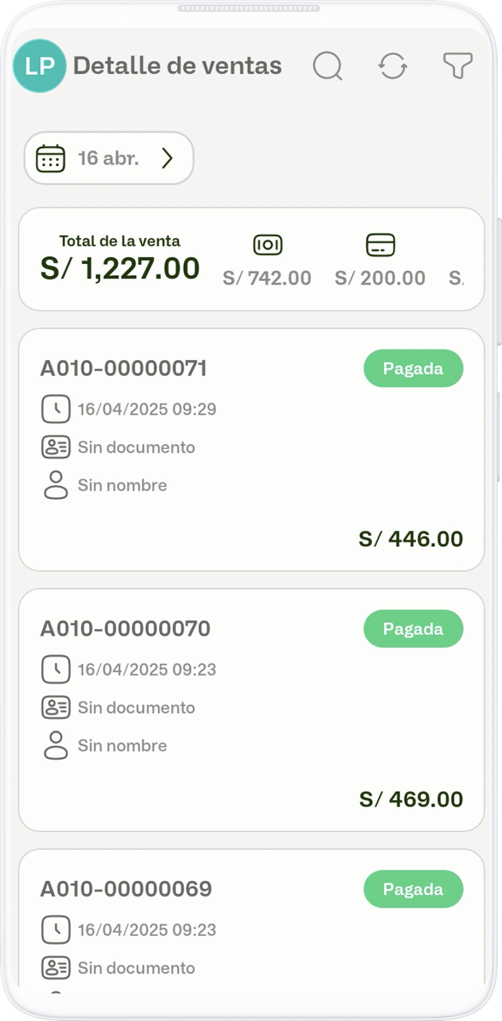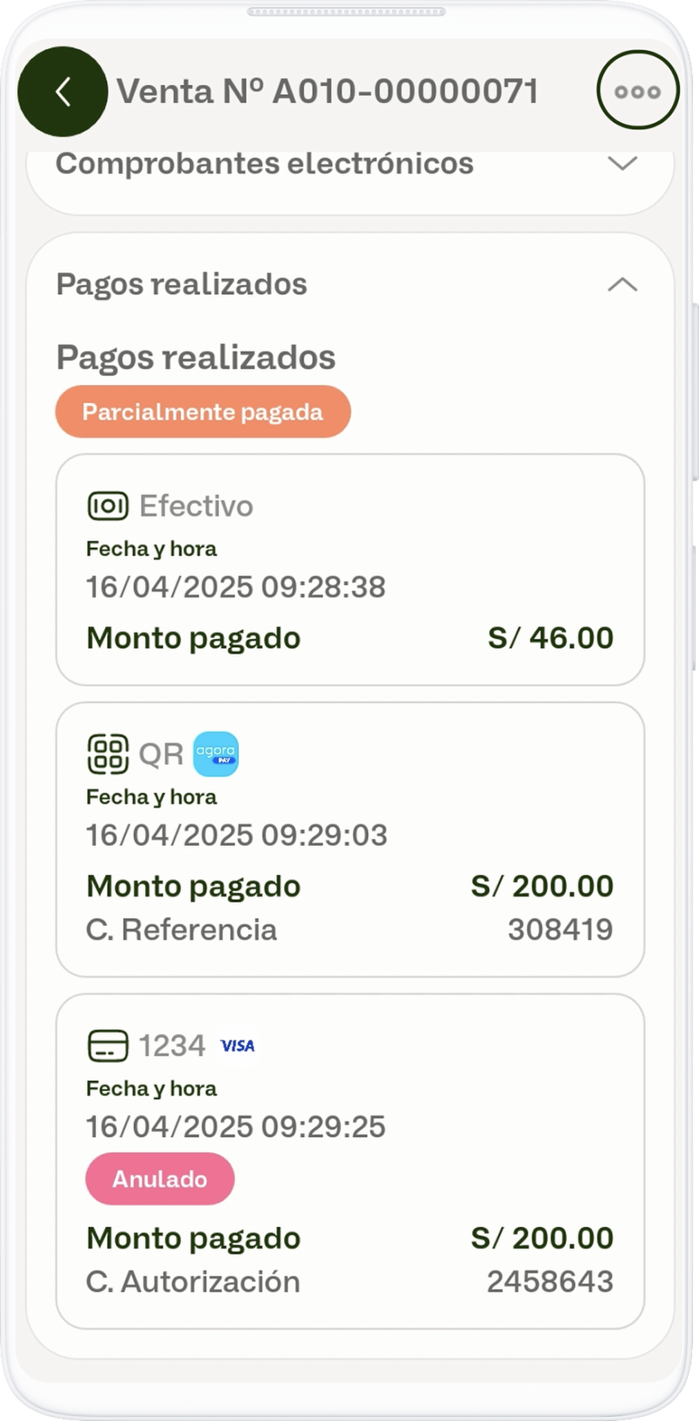 11. El pago queda anulado, si deseamos registrar nuevamente un cobro para esta venta, tocamos los "3 puntos" en la parte superior derecha de la pantalla. | |