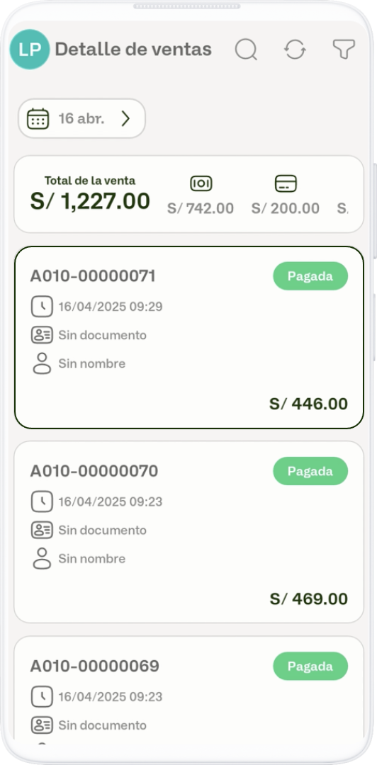 5. Seleccionamos y/o tocamos la venta en la cual haremos la anulación del pago. | ![]() |