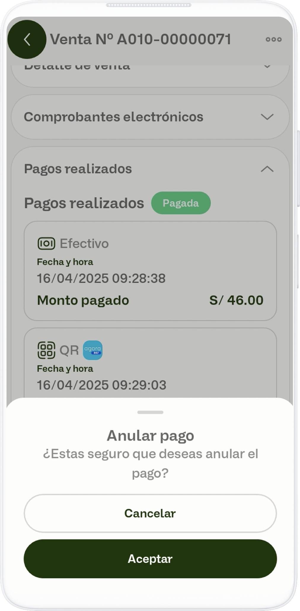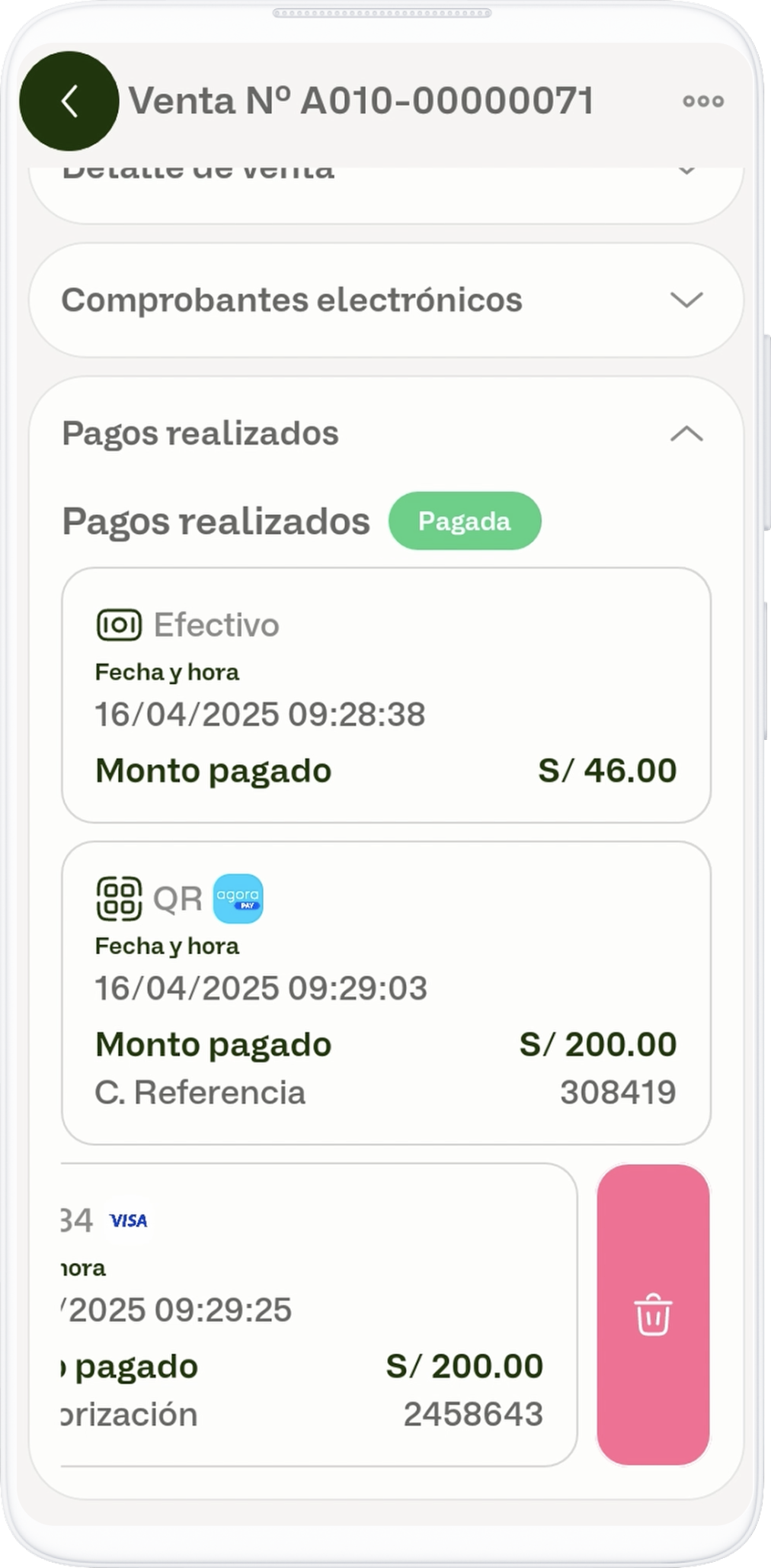 7. Aquí encontramos los pagos asociados a la venta, tocamos el pago que vamos a anular y deslizamos hacia la izquierda.
