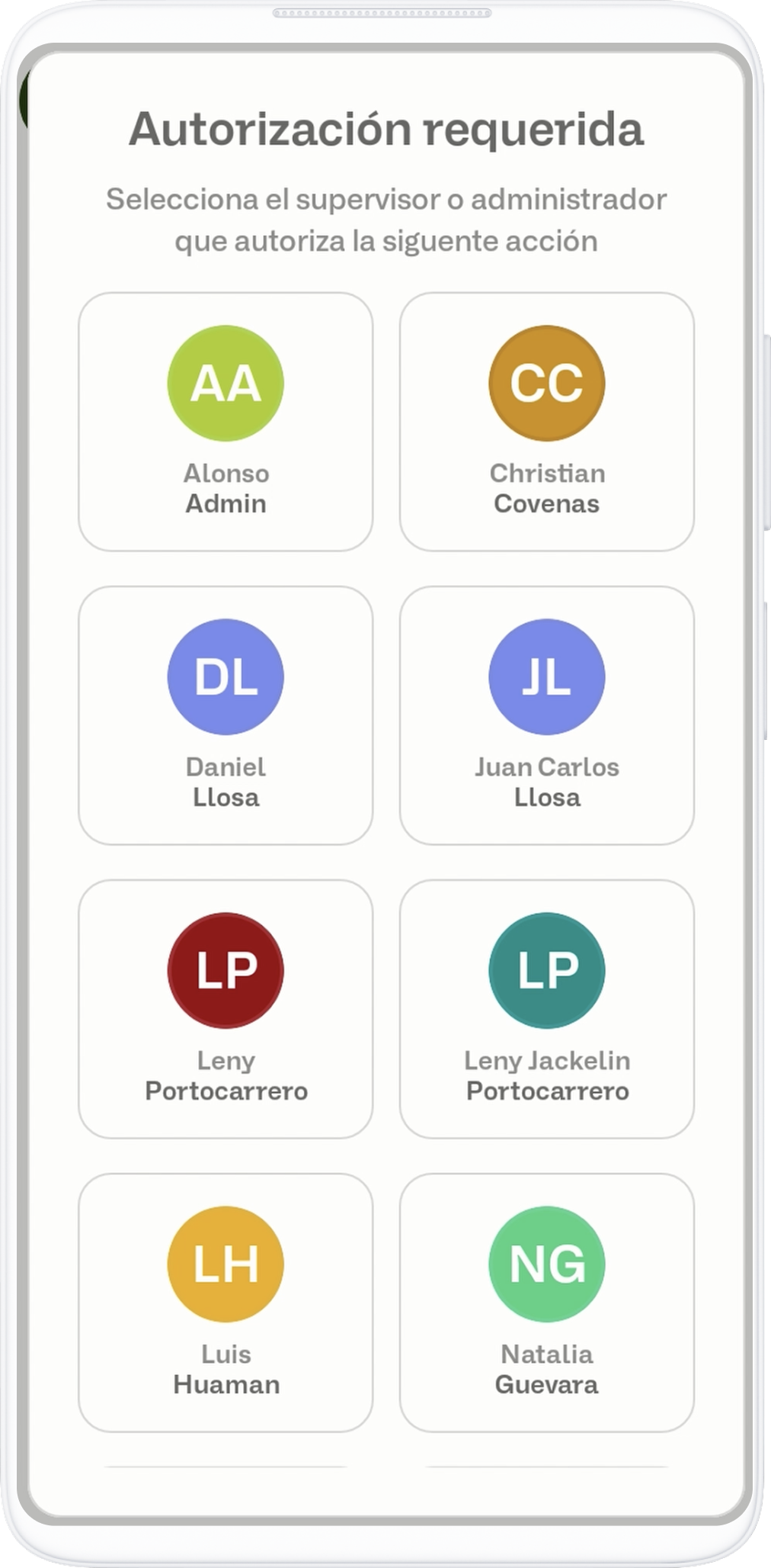 ![]() | 10. Un usuario administrador o supervisor, selecciona en pantalla el usuario que le corresponde, luego ingresa su PIN de acceso o contraseña para autorizar. |