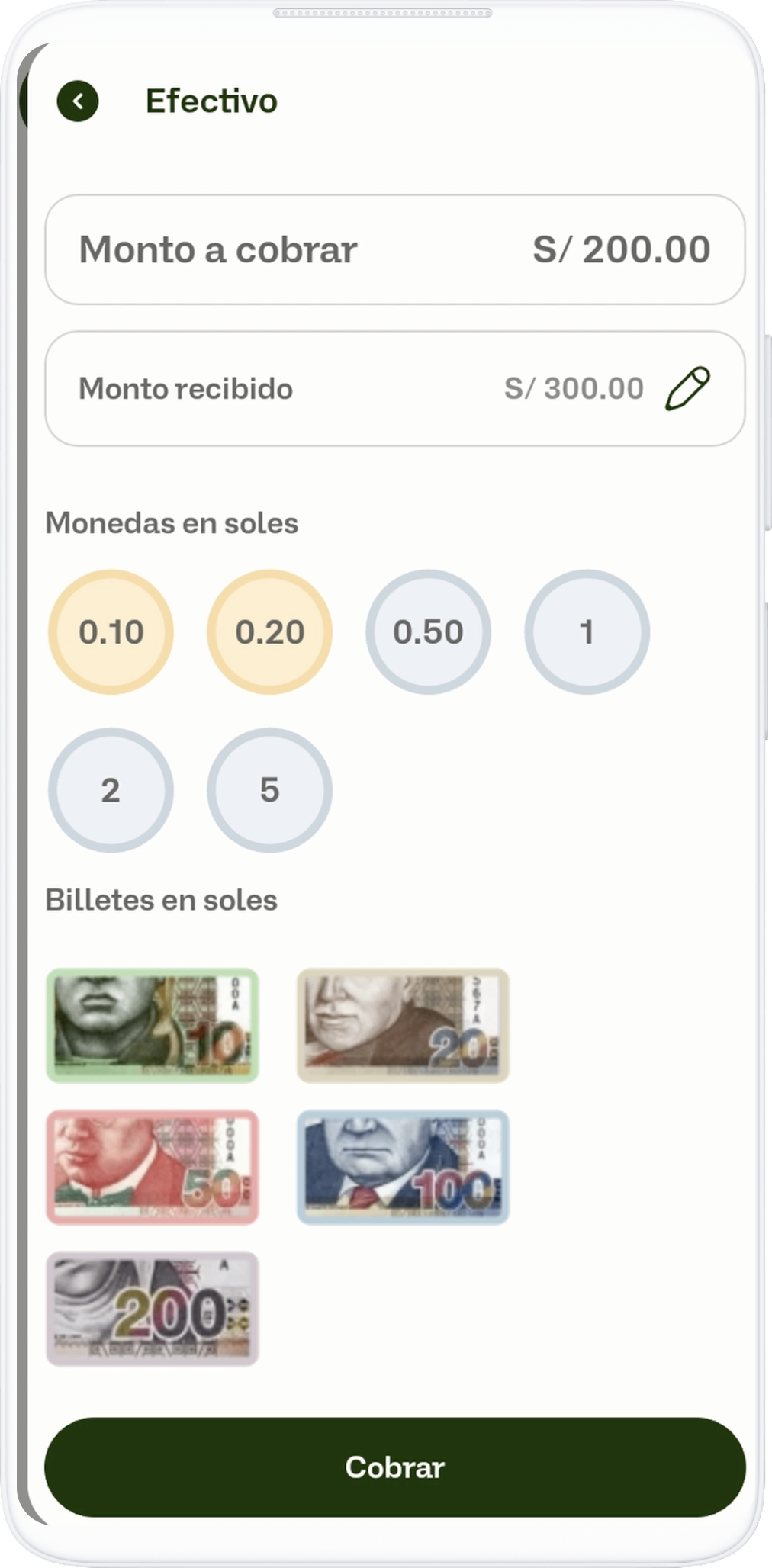![]() | 16. Paso seguido ingresamos los billetes y monedas recibidos y presionamos en “cobrar”. |